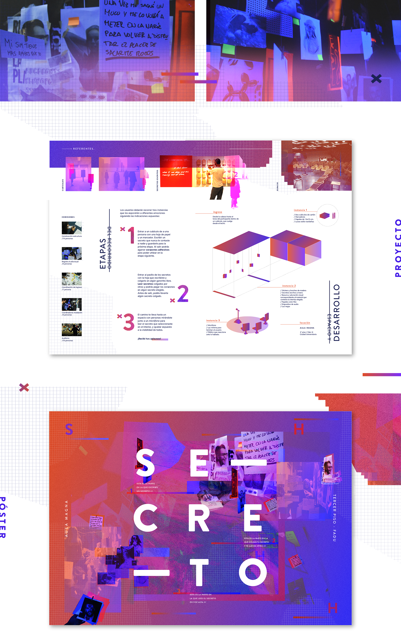 Buscando representar la interfaz elegida de forma analógica, se generó una instalación de 2,50 metros de largo. El proyecto consta de una primera instancia donde se le pide al usuario que escriba un secreto. Al salir, tenés la opción de agarrar corazones autoadhesivos (likes) para utilizar en la etapa siguiente. Una vez dentro de la segunda instancia, el túnel. El usuario recibía un exceso de estímulo visual, cantidades abrumadoras de posts, simulando el contenido que recibimos casi inconscientemente todo el tiempo vía redes sociales. La interacción de esta etapa es principalmente la del intercambio anónimo de secretos ya que, dejás tu secreto y salís del túnel con el secreto de alguien más. Este punto es una de las características más particulares de Tumblr, donde los usuarios no utilizan sus nombres reales para hacer posteos y encuentran en esta interfaz la libertad para postear sobre cualquier tema que además puede rebloggearse haciendo así que los posteos de alguien más se encuentren en tu perfil. Esta etapa se estructura con uno de los principios que enumera Manovich sobre los nuevos medios: la modularidad. Al quitarse una de las piezas de la instalación (un secreto), no se modificaba la idea total del proyecto y además, cada secreto funcionaba también individualmente. La última instancia busca exponer a las personas a que lean el secreto que eligieron durante el recorrido, frente a un micrófono y adelante de una audiencia expectante, lista para aplaudir y reaccionar de formas variadas.